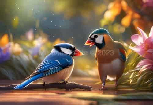 Deux oiseaux, une mésange bleue et un bouvreuil pivoine, semblent échanger en douceur sur un fond de lumière dorée et de fleurs épanouies, dans une scène empreinte de quiétude.