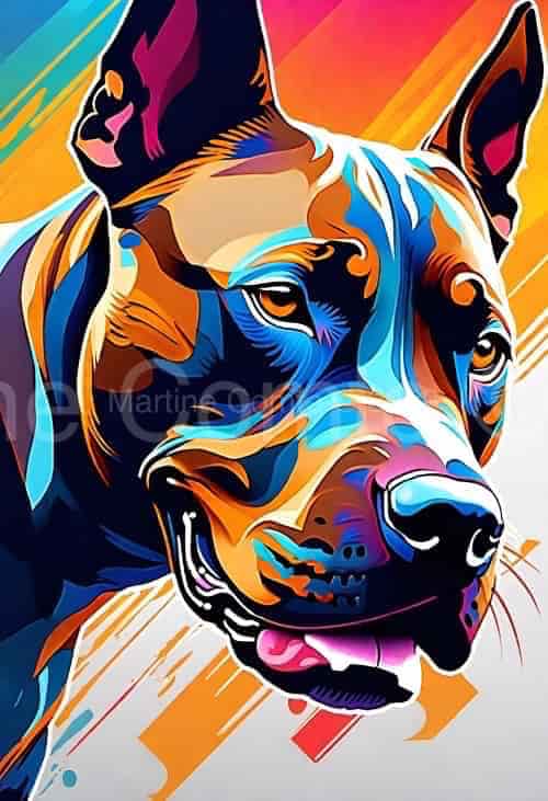 Portrait audacieux d’un Doberman baigné de couleurs vives. L’harmonie des teintes bleues, oranges et roses évoque une énergie vibrante et une profondeur émotionnelle.
