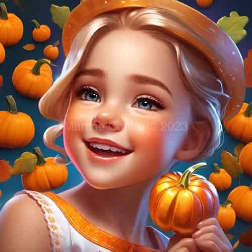 Une jeune fille radieuse avec des yeux pétillants tient délicatement une petite citrouille dans ses mains. Elle est entourée d’une pluie de citrouilles sur un fond bleu, créant une atmosphère festive et chaleureuse évoquant la saison d’automne.