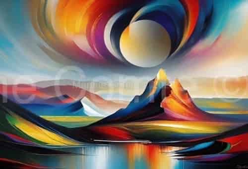 Une explosion de couleurs, représentant un paysage montagneux enveloppé dans une aura mystique. Le grand corps céleste au-dessus semble être à la fois une lune et un soleil, irradiant des couleurs vives qui se déversent dans le ciel et se reflètent dans le miroitant plan d’eau en dessous. La représentation artistique des montagnes et des reflets dans l’eau ajoute une dimension de rêve à cette œuvre.